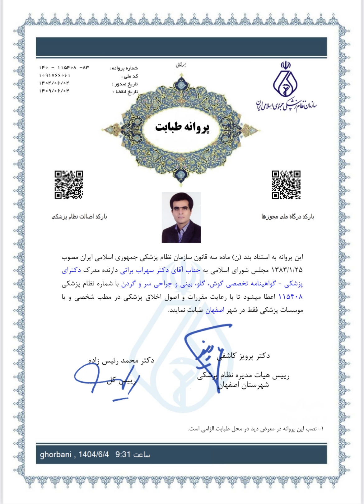 جهت دریافت اطلاعات بیشتر از مجوزات جراح؛دکترسهراب براتی درسازمان نظام پزشکی